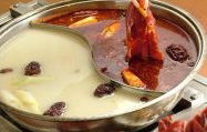 太極マークデザインの鴛鴦火鍋に赤と白のスープ。